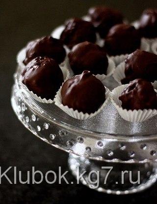 Шоколад растопите на водяной бане. Шоколад остудите и каждый шарик обмокните в смесь. Конфеты должны застыть - и смло подавайте к кофе.