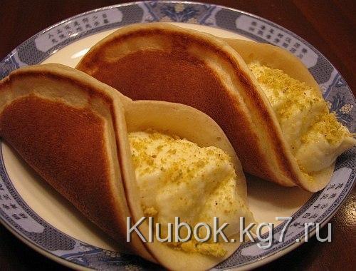 5. Готовые блинчики складываются незажаренной стороной внутрь, а его края нужно слепить до середины. Заполнить кремом с помощью кондитерского шприца.