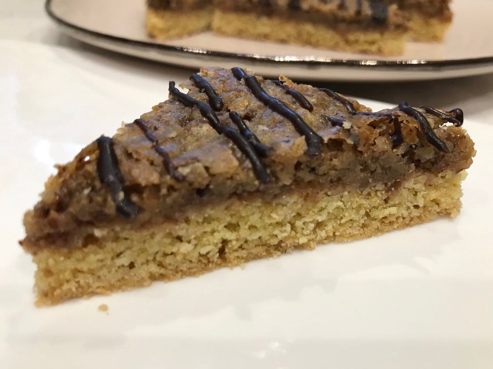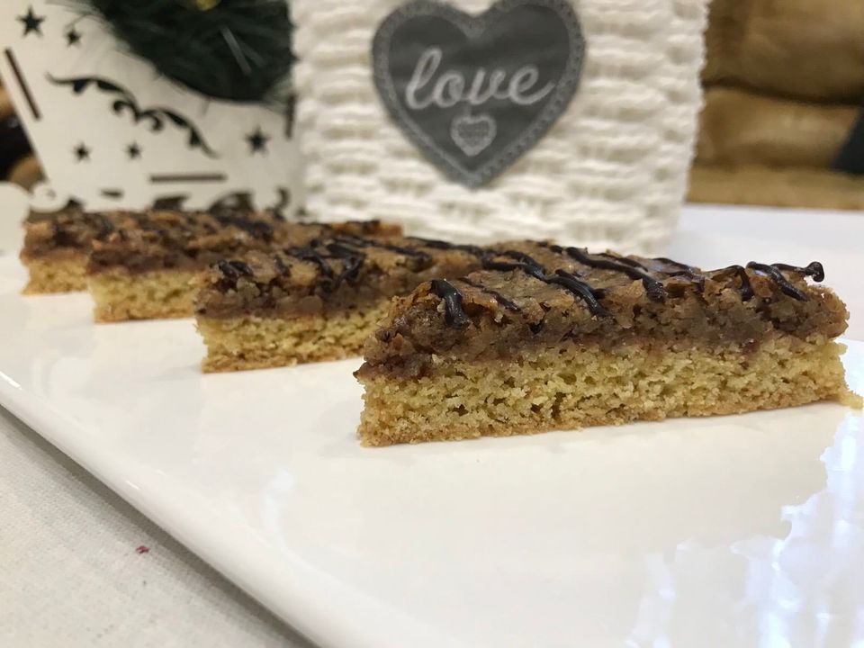 До просіяного борошна з розпушувачем додамо сіль, цукор,ван.цукор, масло і розтираємо у крихту. Додамо яйця і замішуємо тісто. Ставимо у холодильник поки приготуємо начинку. Сотейник з водою,,маслом,цукром і ван.цукром ставимо на вогонь. Доводимо до кипіння. Знімаємо і до цієї суміші додамо горіхи. Перемішуємо. Тісто розкачуємо у пласт до форми деко. Викладуємо верення і рівномірно розмащуємо. Викладуємо горіхову начинку і теж розрівнюємо. Випікаємо при 180 °С, приб. 20-25 хв. Даємо охолонути. Вибираємо з деко і нарізаємо квадратиками ( у мене по 6 см). А потім трикутниками. Прикрашаємо за бажанням.
