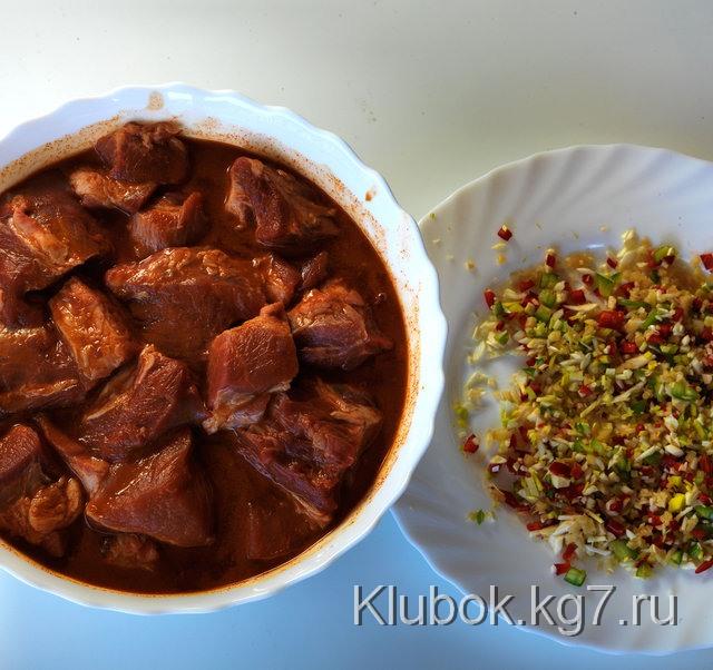 Порежьте небольшими кусочками заднюю часть бараньего бедра. Курдюк порежьте плоскими квадратиками. Перемешайте мясо и сало с солёным луком, зирой, раздавленными семенами кориандра и чёрным перцем.