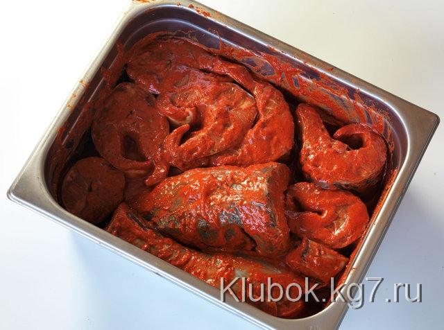 Три ложки простого йогурта (катык, мацони, даже сметана – всё это подойдёт), полторы ложки томатной пасты, две столовые ложки индийской смеси «Тандури масала», пол головки чеснока, хороший кусочек имбиря, столовую ложку паприки, семена кардамона из десяти стручков, чайную ложку красного перца, пару ложек растительного масла, соль – всё это измельчить и смешать при помощи блендера и нанести на рыбу. Оставить на шесть часов в прохладном месте.