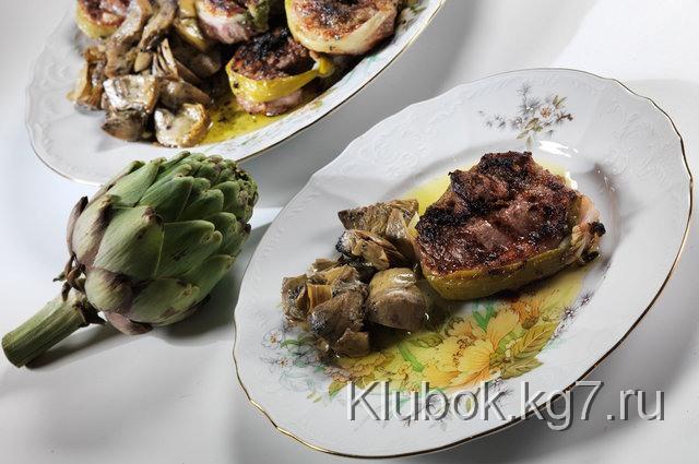 Подавайте с маринованными артишоками и оливковым маслом, запивайте вином, но в следующий раз перевязывайте стейк не по кругу, а крест-накрест, надрезав в нужных местах жир. Так можно будет пожарить стейки и с боков, да вытопить из сала ненужный жир. А вот аппетитные выжарки по краям этого стейка будут очень уместны!