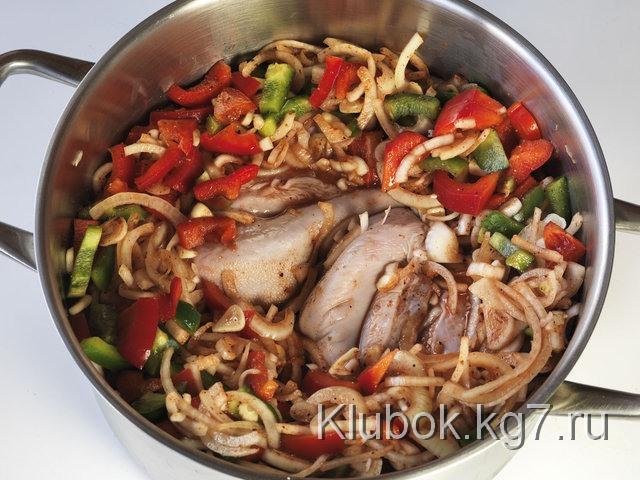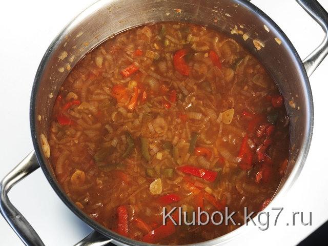 Смотрите, языки помещаются в овощную смесь из лука, болгарского перца, чеснока и протёртых помидоров. Всё солится и приправляется. И… на огонь! Да, пусть на очень маленький, но на огонь.