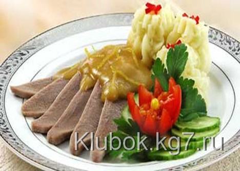 Подготовленный язык обжаривают с обеих сторон в кипящем масле и вынимают. В то же масло кладут мелко нарезанную морковь, корень сельдерея и лук, посыпают их мукой и поджаривают. Овощи соединяют с томатным соком, уксусом, кладут язык, заливают все бульоном или теплой водой, солят по вкусу, приправляют черным перцем, лавровым листом и тушат на слабом огне. Готовый язык вынимают, а соус протирают через сито и заправляют сливочным маслом. Соус должен быть не очень густым. Язык нарезают тонкими ломтиками. На гарнир подают картофельное пюре и пюре из шпината.