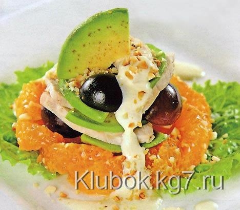 Еще один салат – салат с авокадо и лососем. Для его приготовления берем 150 г филе лосося, апельсин, авокадо, пучок зеленого лука, по 60 г шпината и кресс-салата, 4 ст. ложки оливкового масла, 2 ст. ложки винного уксуса, 1 ч. ложка тмина, соль и перец. Рыбу следует предварительно обжарить (2-3 мин) и разобрать на кусочки. С апельсина срезают кожуру, трут ее на мелкой терке, а мякоть делят на дольки, удаляя пленки. Авокадо также очищают от кожуры и режут кусочками, лук мелко рубят. На блюдо выкладывают дольки апельсина, зеленый лук, кусочки авокадо, листья кресс-салата и шпината, а затем кусочки рыбы. Масло, уксус и тмин смешивают, солят и перчат по вкусу. Этим соусом заливают салат и украшают шнитт-луком. Вкус совершенно экзотический.