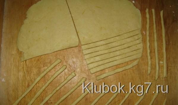 4. Раскатайте тесто в пласт, толщиной 0,5 см, нарежьте его на полосочки и каждую полосочку скатайте пальчиками в трубочку.