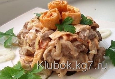 4. Соединить печень, лук и лепешки, немного посолить, заправить майонезом и выложить в салатник.