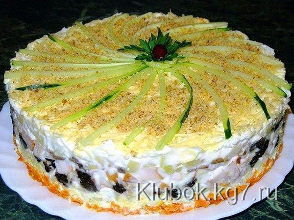Слоеный закусочный торт с копчёной курицей, черносливом и шампиньонами