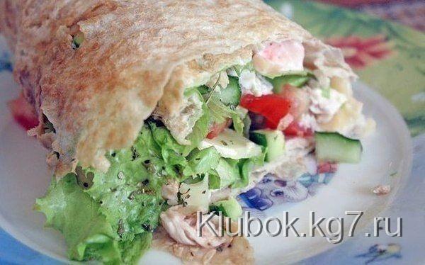 Chicken in Lavash For one large portion of 300 grams you will need: A sheet of thin Armenian lavash Baked chicken breast in foil (or just chicken), 100 grams Lettuce leaves Tomatoes, cucumbers Cheese 50 grams Spices, Provencal herbs to taste For the dressing you will need: 15 grams of homemade, natural yogurt (can be replaced with sour cream) 2 tsp soy sauce 3 tbsp adjika (ketchup or any other sauce) Preparation: Spread the lavash with yogurt and adjika Place the lettuce leaves, then the sliced chicken, cheese, and add vegetables on the lavash Sprinkle everything with spices, I used Provencal herbs Roll everything into a tight tube Enjoy your meal!