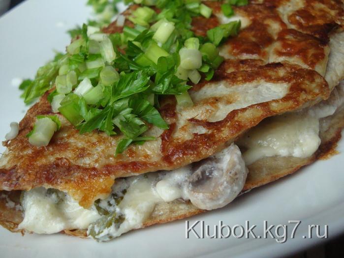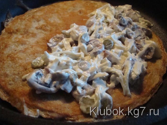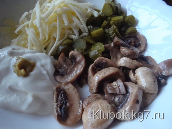 While it is frying, cut the champignon mushrooms and sauté them a bit. Place them in a bowl, add the cucumber cut into strips (I have small cornichons, so I cut them into rounds), cheese (I have a type of mozzarella, but you can use any kind), sour cream, mustard, minced garlic and mix. The filling is ready! Optionally, you can add ham