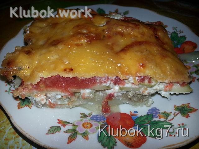 :картофель – 5-6 шт.;молодые кабачки – 2-3 шт.;мясной фарш – 300 г;лук репчатый – 1 шт.;помидоры – 4-5 шт.;сыр твердый – 150 г;зелень базилика или петрушки;майонез – 200 мл;чеснок – 2 зубка;масло растительное;перец черный молотый;соль.Рецепт запеканки из кабачков: