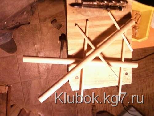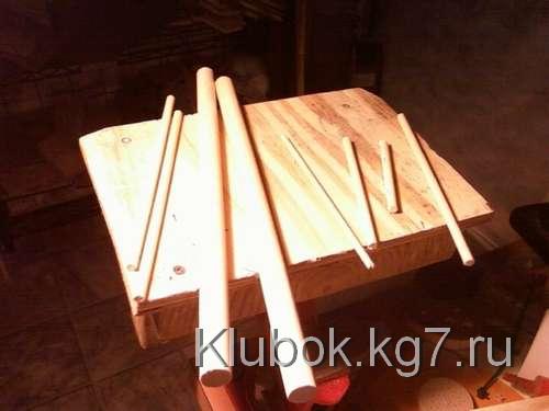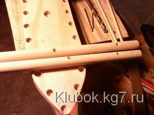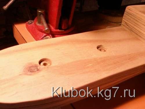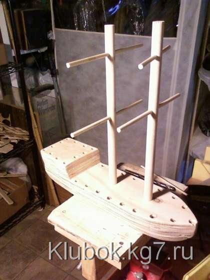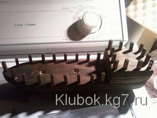 Я просверлил два 3 / 4 "отверстия посередине палубы, приблизительно 4" друг от друга, и около 1 / 2 "глубиной. Я отметил карандашом, где должны быть перила по всей палубе, смещение от края около 1 / 2 ", а затем пробурено в каждой маркировке с 1 / 8" немного. После этого я использовал 3 / 8 "бит для бурения около 1 / 4" ,также пробурены 1 / 8 "отверстие для треугольного паруса 40 градусов, 1" под палубой в самом носу.