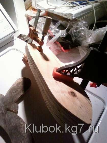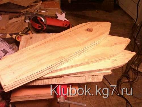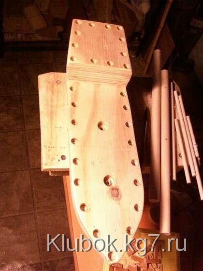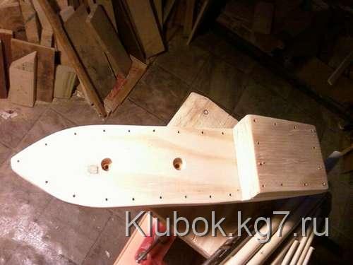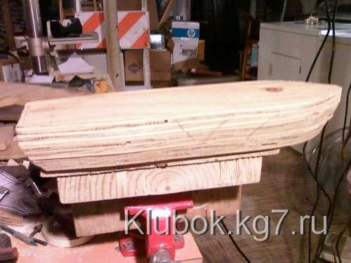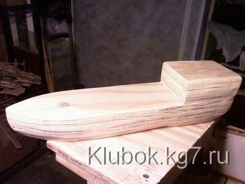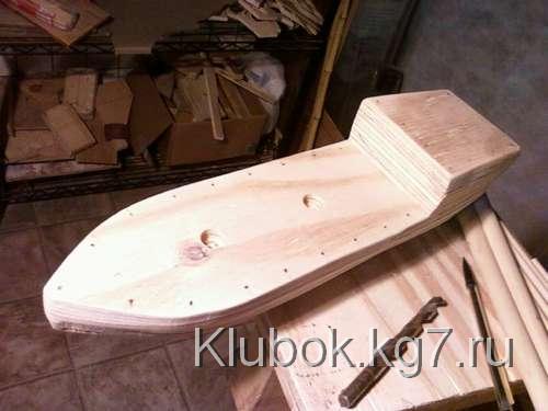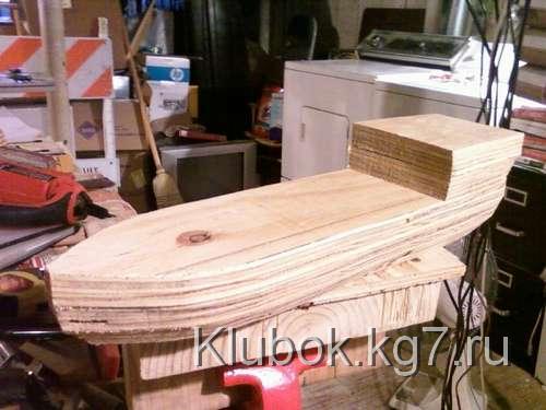 Я применил достаточное количество столярного клея между тремя слоями, зажал их вместе выравнивания луки и корму, и остановил на ночь. После того, как высохнет, я сделал задние 4 "верхний слоя фанеры корме , используя тот же метод я склеивал, что и палубу, он зажимал, и давал высохнуть .
