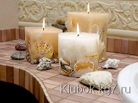 — Можно макнуть готовую свечу в горячий воск как в клей и обвалять в речном песке с ракушками или без;
