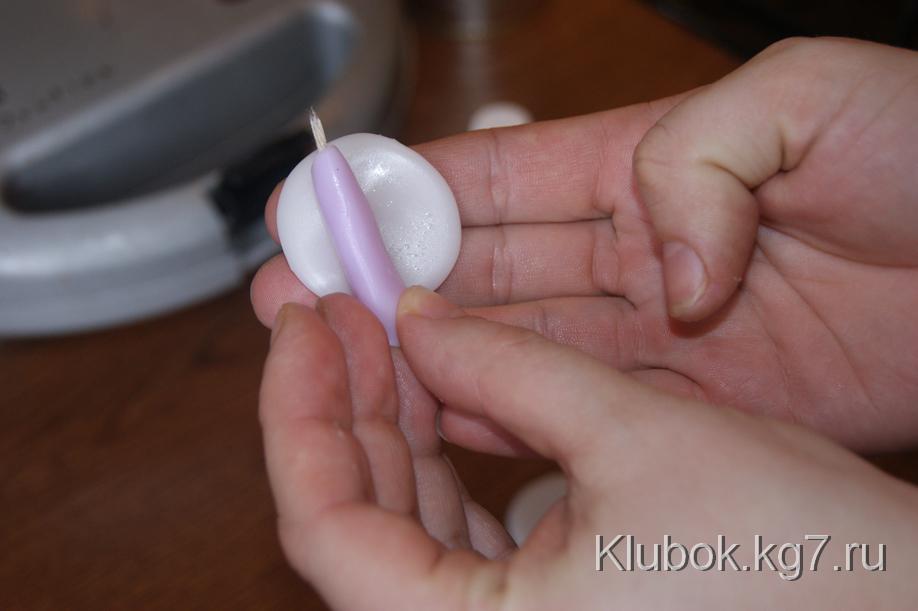 Нужно не пропустить момент,когда парафин станет пластичным,но не ломким. Как поймали момент,лепим цветок,оборачивая лепестки вокруг серединки с фитилем,осторожно прижимая.