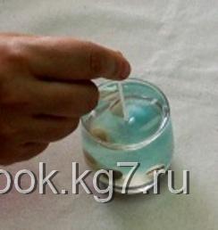 Ждем 15 минут, затем аккуратно погружаем фитиль в немного застывшую массу. Лишний фитиль отрезаем.