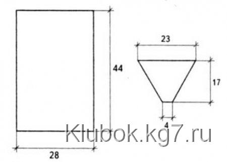 Затем свяжите клапан. Наберите цепочку из 60 возд. п. и вяжите ст. с/н 10 рядов, затем вяжите следующим образом: 1-й ряд - *3 ст. с/н, 2 возд. п.*, 3 ст.