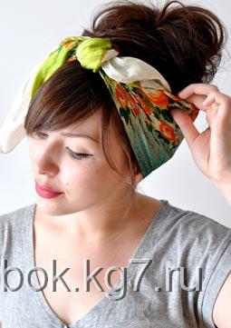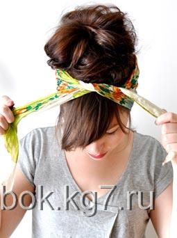 Обверните шарф вокруг головы концами вперед, убедившись, что сторона шарфа со складками окажется внутри. Под платок, завязанный таким образом, подойдет высокая прическа с хвостом пончиком.