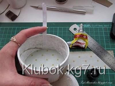 Нарежем полосочки для фиксации донышка, например, крафтбумагу. Полосочки 2 на 6 см (приблизительно), штук 5-6. Вообще, можно и на клей посадить.