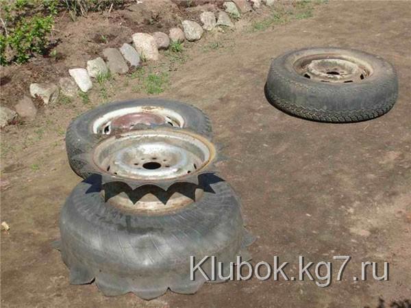 В первую очередь необходимо нанести рисунок на покрышку, по которому сделаем вырез острым ножом. Рисунок может иметь форму волны, чешуи, шипов и т.д.
