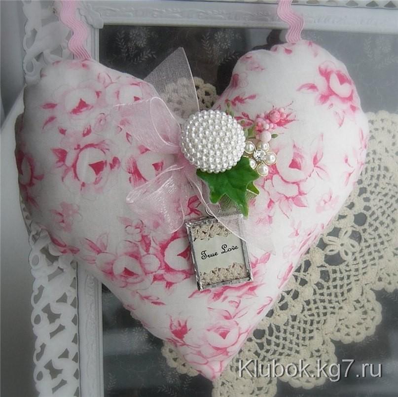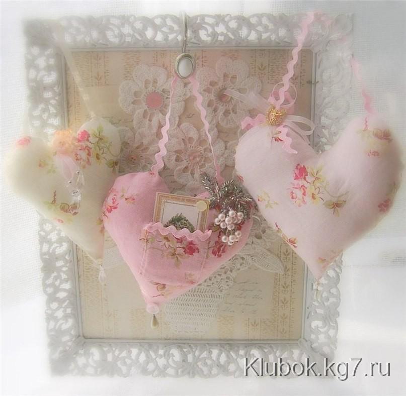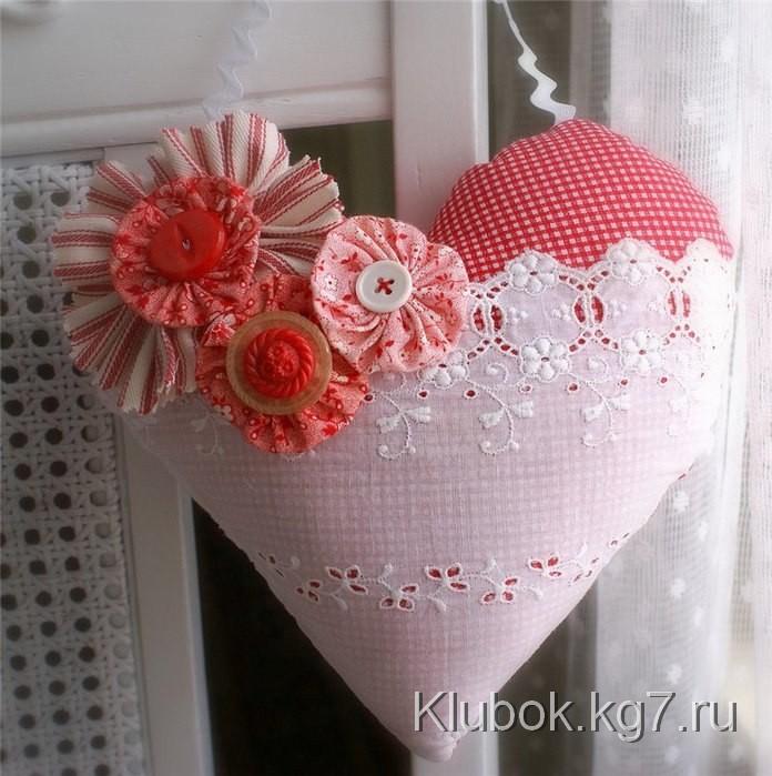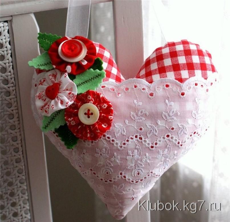 Теперь необходимо сразу украсить наше сердечко - пришить у нему ленты, кружево, вышить картинку бисером или крестиком. После того, как декор заготовок валентинки будет завершен, необходимо сложить детали одну к другой лицевой стороной и прошить по намеченному контуру сердца, оставив небольшой отрезок, через который в дальнейшем Вы легко выверните сердечко лицевой стороной наружу и наполните синтепоном. Не забудьте так же заранее на заготовки пришить ленточки-петельки для подвешивания вашей валентинки из ткани.