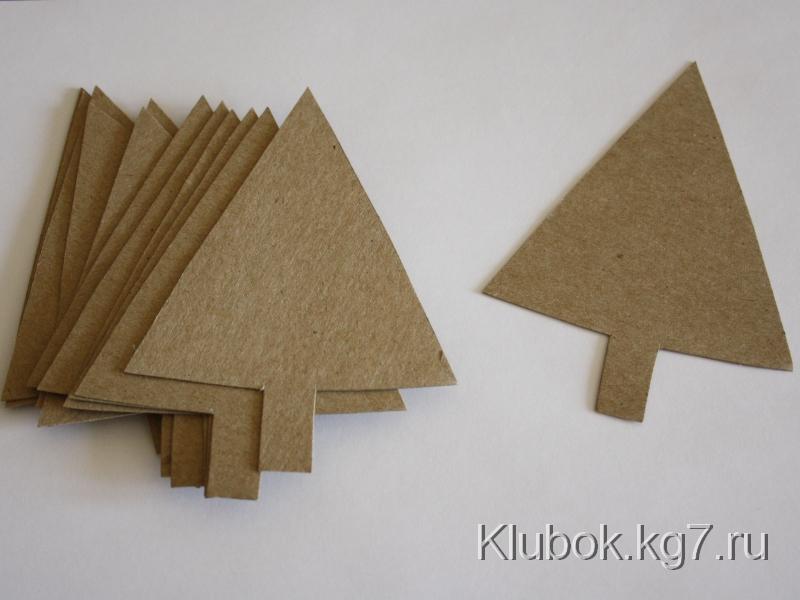 Для начала вырежем из плотного картона заготовки для будущих ёлочек (мои ёлочки 12 см в высоту и 9 - в ширину). Я использую для этого крафт-картон - он достаточно плотный, чтобы выдержать самые разнообразные манипуляции, и к тому же приятный на вид.
