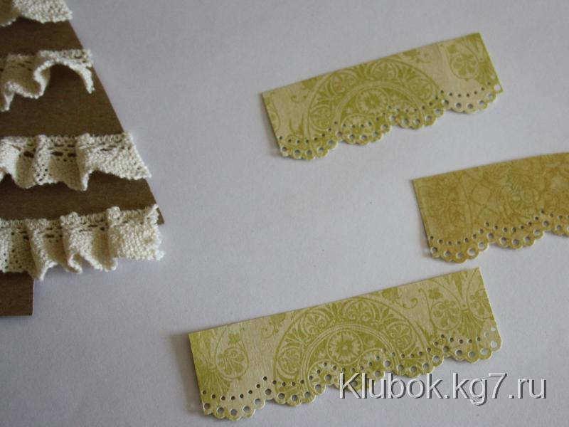 Из бумаги для скрапбукинга вырезаем отрезки шириной в полтора раза больше ширины кружева, один из длинных краев которых делаем кружевными при помощи дырокола либо фигурных ножниц.