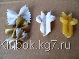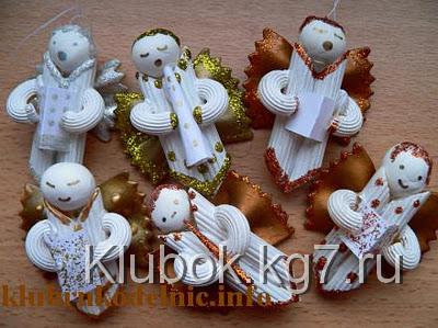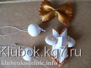 А мы научимся красивые елочные украшения делать из макарон. Посмотрите, как из макарон разной формы сделать ангелочков.