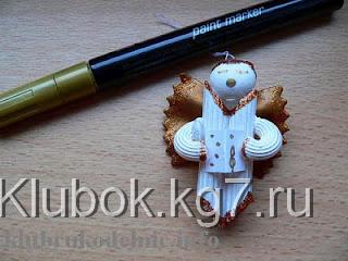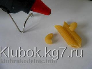 двух крупных макаронин склеим тело ангелочка. По бокам приклеим ручки из рожек.