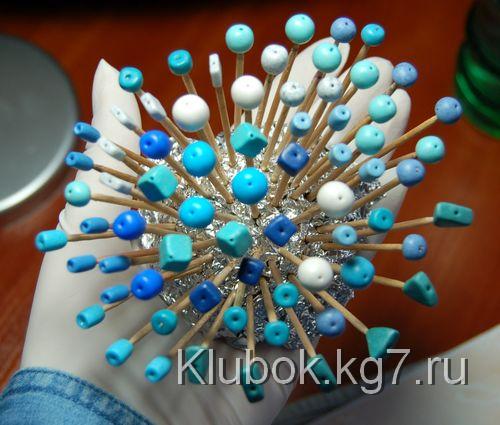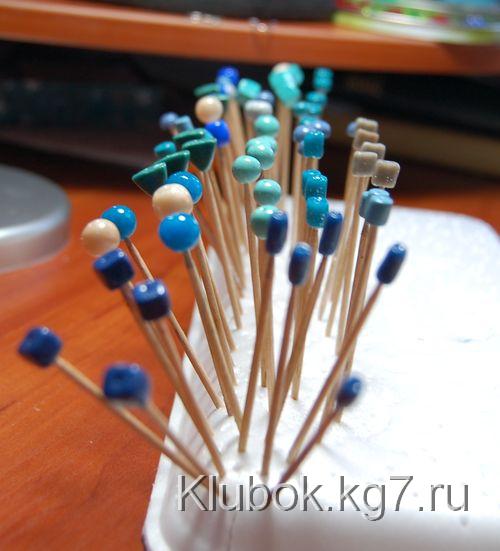 сминаем фольгу в шарик, делаем плоское дно, насаживаем наши бусины на зубочистки, стараясь не сильно расширять отверстие, втыкаем в фольгу