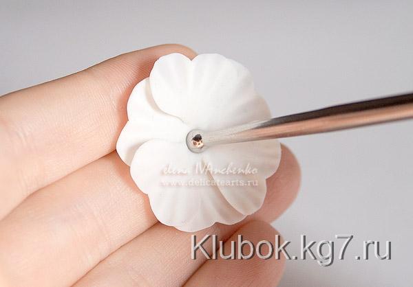 снимая цветка со стека, прикрепляем глину с обратной стороны цветка. Пока глина