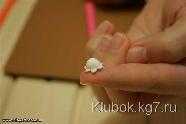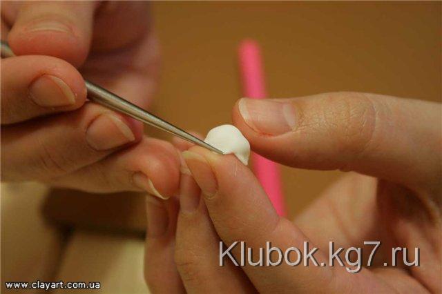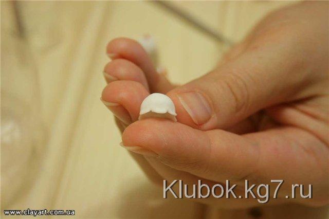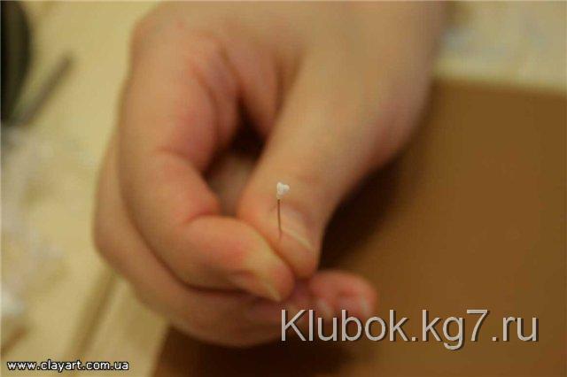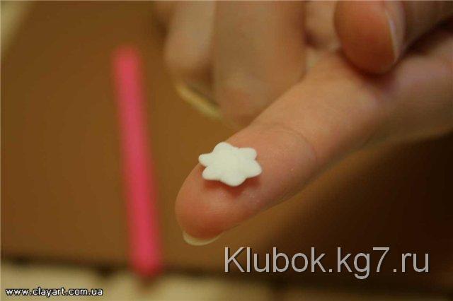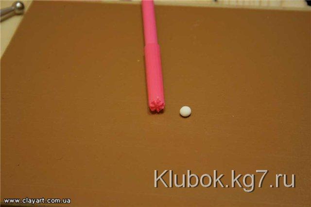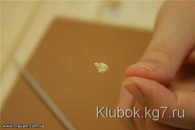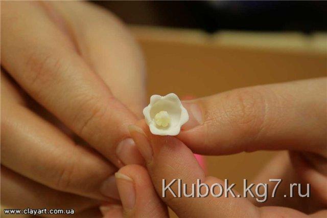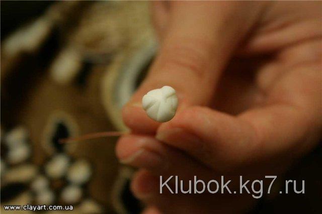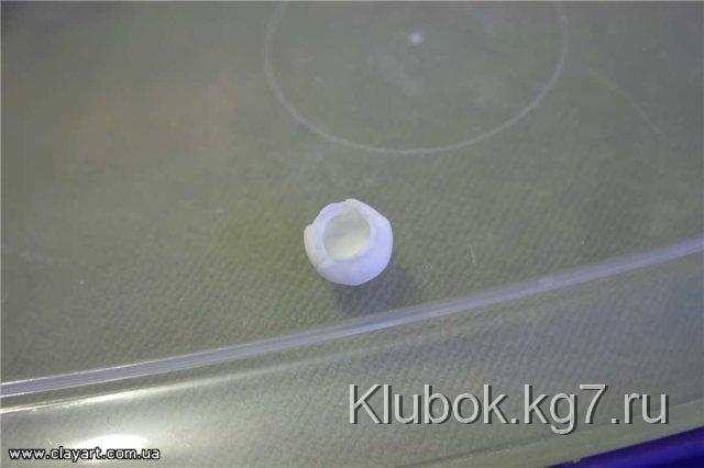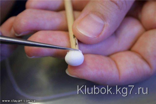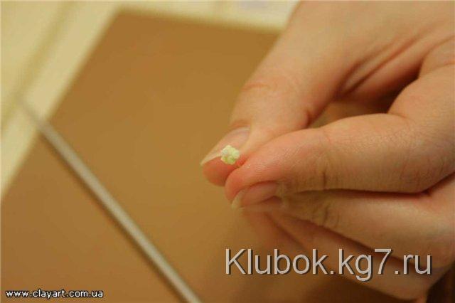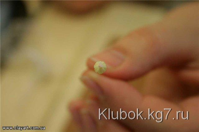 Далее, для того, чтобы слепить хорошо раскрывшийся цветок, мы возьмем шарик фарфора, диаметром примерно 4 мм и прилепим его по центру цветка: