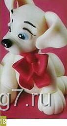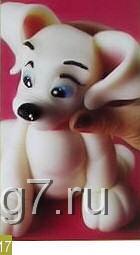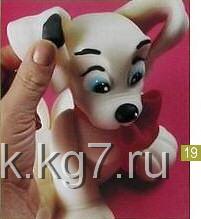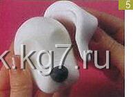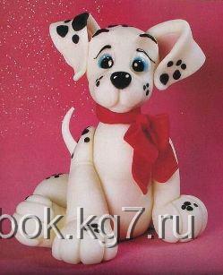 И в конце возьмите несколько маленьких кусочков черного фарфора, придайте им овальную форму и налепите по всему туловищу щенка, имитируя пятна долматинца.
