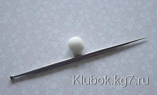 Берем небольшой кусочек глины и стек. Для наглядности я положила этот кусочек рядом со стеком, чтобы было видно, сколько примерно глины понадобится для этого лепесточка.