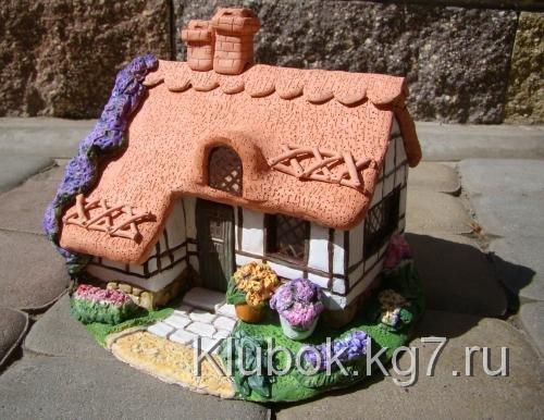 Если раньше при изготовлении домиков я использовала разные материалы - водоросли как деревья, монтажную пенy, камешки, то на этот раз домик, подставку, цветы я сделала (для «удобства эксплуатации» — ведь в конце концов, пыль с него придется вытирать из керамической массы Keraplast.