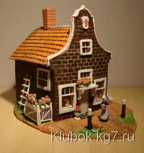 откуда берутся идеи для домиков? Вот такой (или почти такой домик) я видела в Голландии, в маленьком городке Эдам. Постаралась передать дух, присущий домам в Голландии — сочетание кладки из темных кирпичей и деревянных деталей, выкрашеных в белый цвет, аккуратные газончики, мощеные кирпичем дорожки и большое количество цветов в горшках — на окнах, на стенах и около домов.