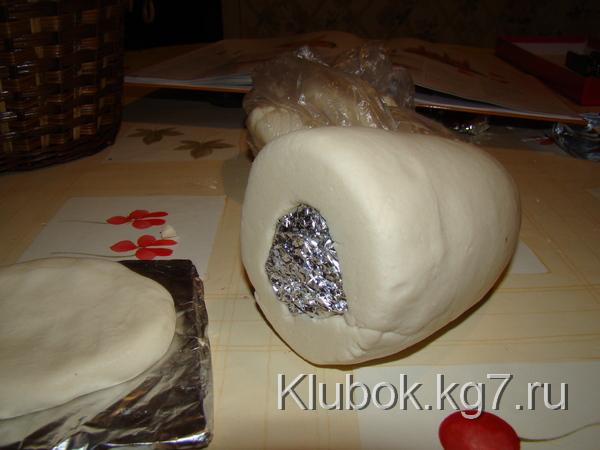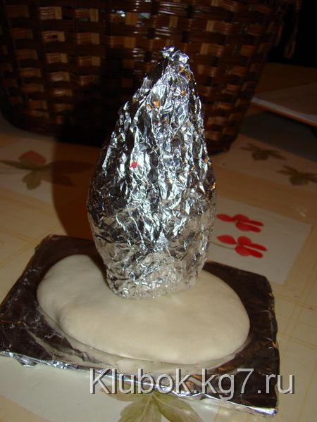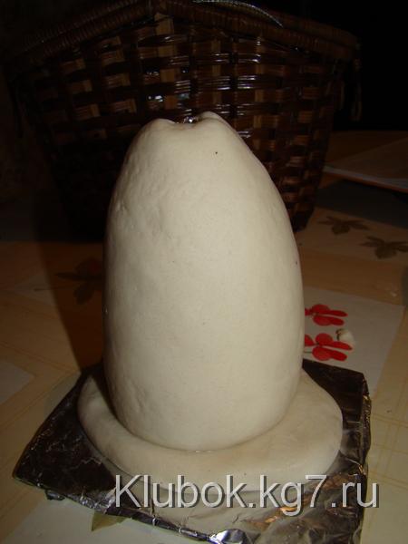 и затем обернуть её тестом.Всё это мы делаем потому что гриб большой(чтобы он лучше держал форму и быстрее испёкся)Мой большой гриб пёкся 13 часов)),в несколько приёмов.Если ваш гриб будет небольшого размера,значит надо просто слепить ножку из теста и прилепить на поставку и воткнуть палочку(чтобы стоял ровненько)