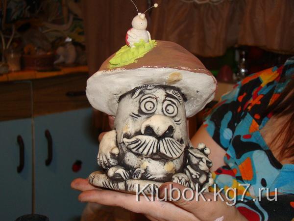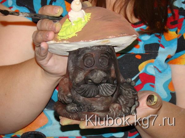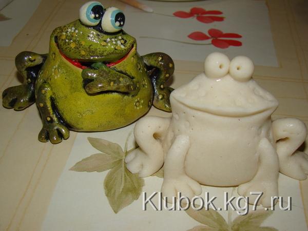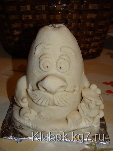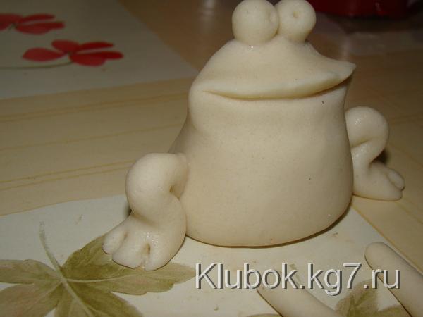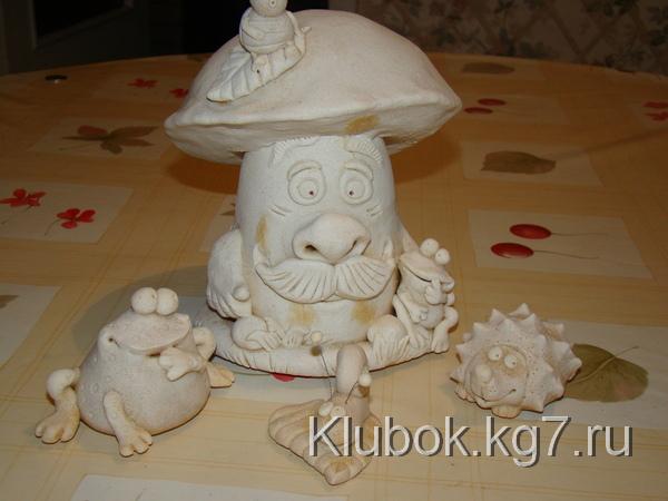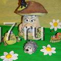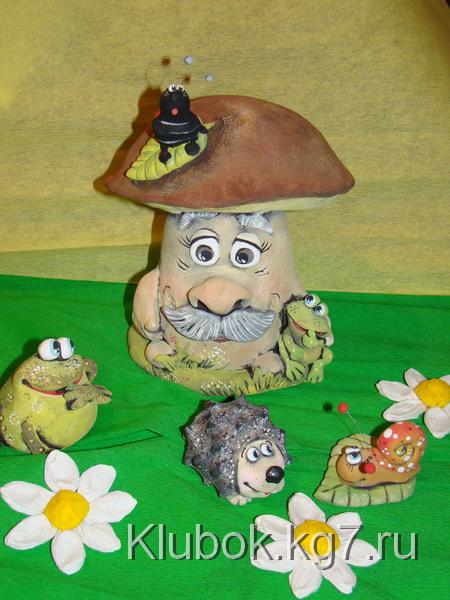 Шляпку можно сформироватьиз фольги и облепить (завернуть) тестом, а можно просто слепить(если гриб небольшой) и надеть -приклеить на ножку.Кстати,если гриб большой советую сначала подсушить часик в духовке ножку, а потом уж одевать шляпку(прямо на горячую приклеить) Ставим сушиться в духовку при минимальной температуре- 100-110гр.Стоит,сушиться .Я решила сделать композицию и слепила ежа,улитку и лягушек.