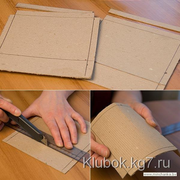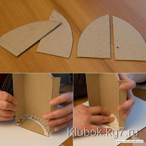 На боковых припусках выполняем надрезы, как показано на фото. Выгибая по форме, прикладываем одну из деталей к куску картона и вычерчиваем контур.