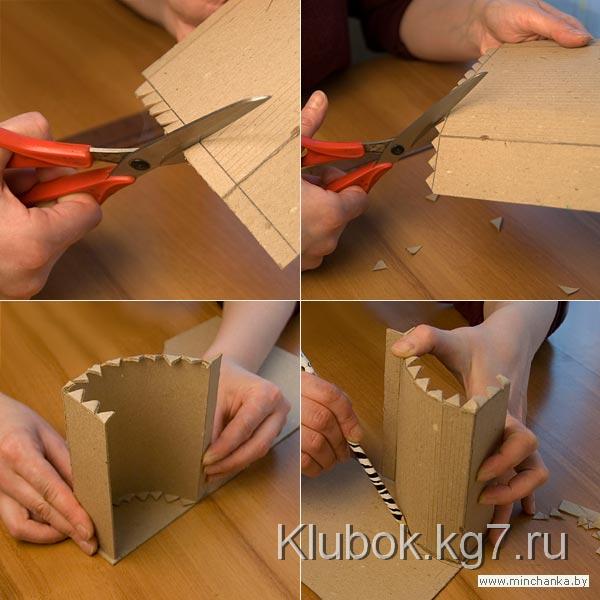 При помощи канцелярского ножа и линейки делаем горизонтальные надрезы на расстоянии 7 мм друг от друга и заполняем ими все пространство кроме припусков. Эту опрацию мы проделали для того, чтобы картон мягко сгибался по форме и не заламывался.