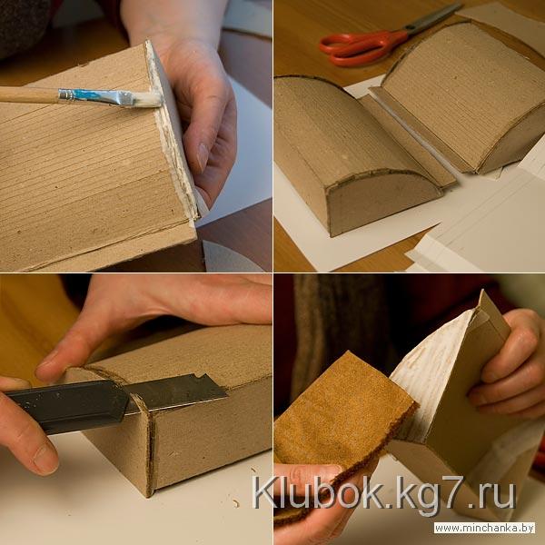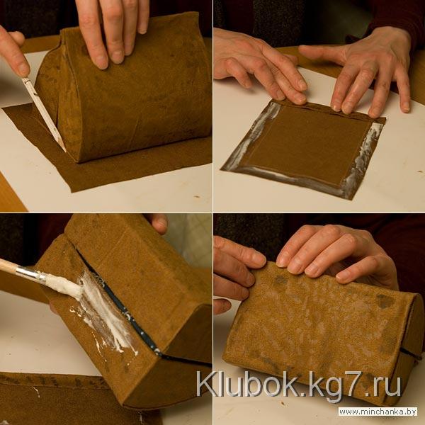 Приклеиваем припуски оклейки боковин, заходя на внешнюю и внутреннюю сторону конструкции.