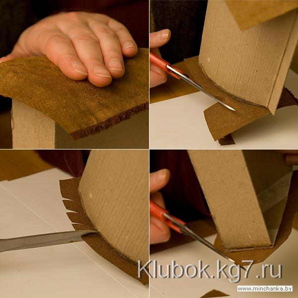 Оклеиваем боковины, срезая ткань по контуру с припуском. После этого надрезаем края бахромой и аккуратно срезаем углы.