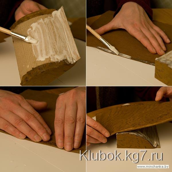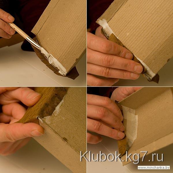 Заполняем щели с внешней стороны клеем и оставляем части "схватиться". После того, как конструкция надежно зафиксировалась, срезаем выступающие края и приступаем к оклейке тканью.