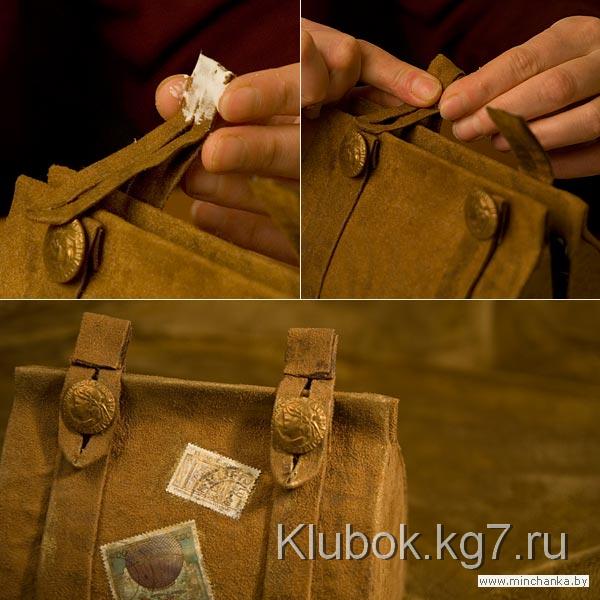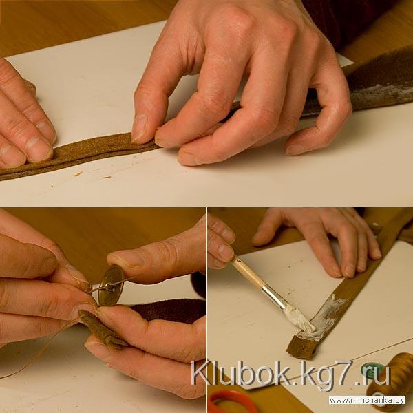 ...приклеиваем ремешки как показано на фото. Из отдельных полосок изготавливаем петельки и приклеиваем их ко второму концу ремешков.