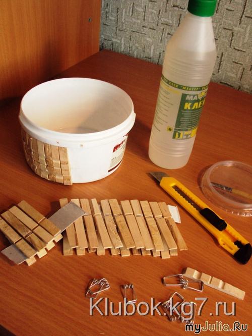 прищепки разобрать на запчасти, понадобятся деревянные детали, поверхность баночки снаружи поцарапать, чтобы прищепки прочно приклеились