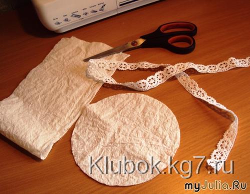 выкроить донышко и бока, сострочить мешочек, оформить его кружевом