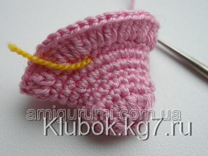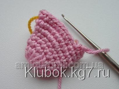 5 ряд: 9 прибавок, 7 сбн [25]. Когда провяжете 4 прибавки, на 5-й протяните маленький кусочек нитки другого цвета (маркер) – так мы отметим середину задней части головы. Она пригодится нам, когда будем вывязывать гребешок, крылышки и хвостик, ведь курочка не должна быть кривой.