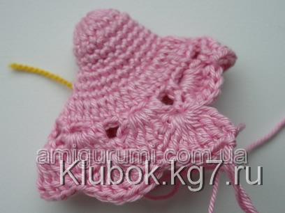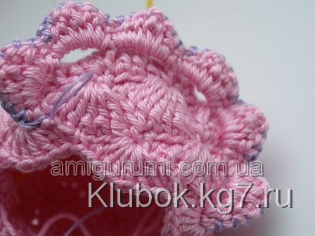 Для курочки делаем цепочку из 8 вп, присоединяясь прямо к туловищу сс, разворачиваем вязание, делаем 4 мини-арки (3 вп, сбн в большую арку), делаем сс в тело, поворачиваем и вывязываем сбн, псн, 2ссн, псн, сбн. Обвязываем ирисом.