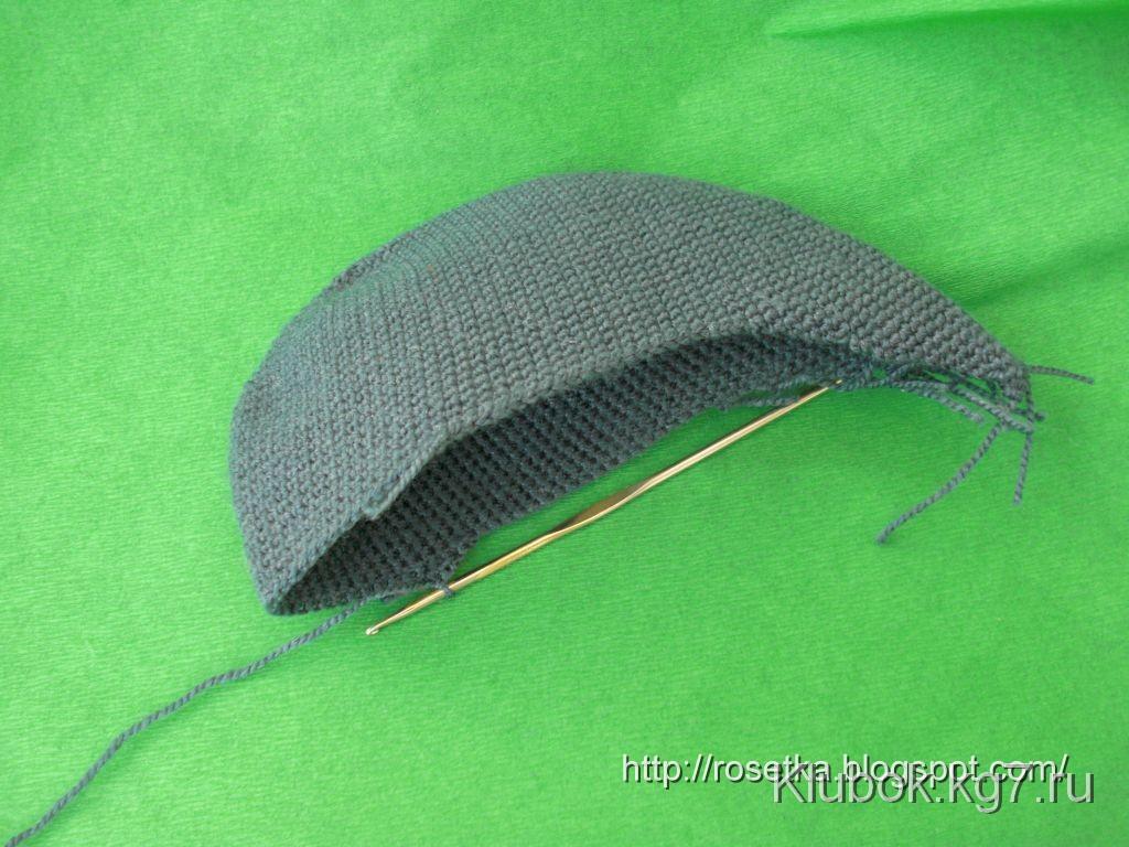 4р. По 2Сбн в каждую из первых двух петель, по 1Сбн в каждую из следующих 20 петель, По 2Сбн в каждую из последних двух петель двух петель этой стороны козырька, 1 пограничный Сбн.