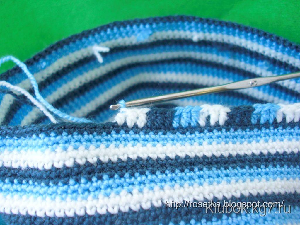 Нижний край кепки решила украсить вот такой полоской, чередуя цвета. При этом при смене нити последний приём провязывания столбика с накидом выполняла нитью нового цвета.